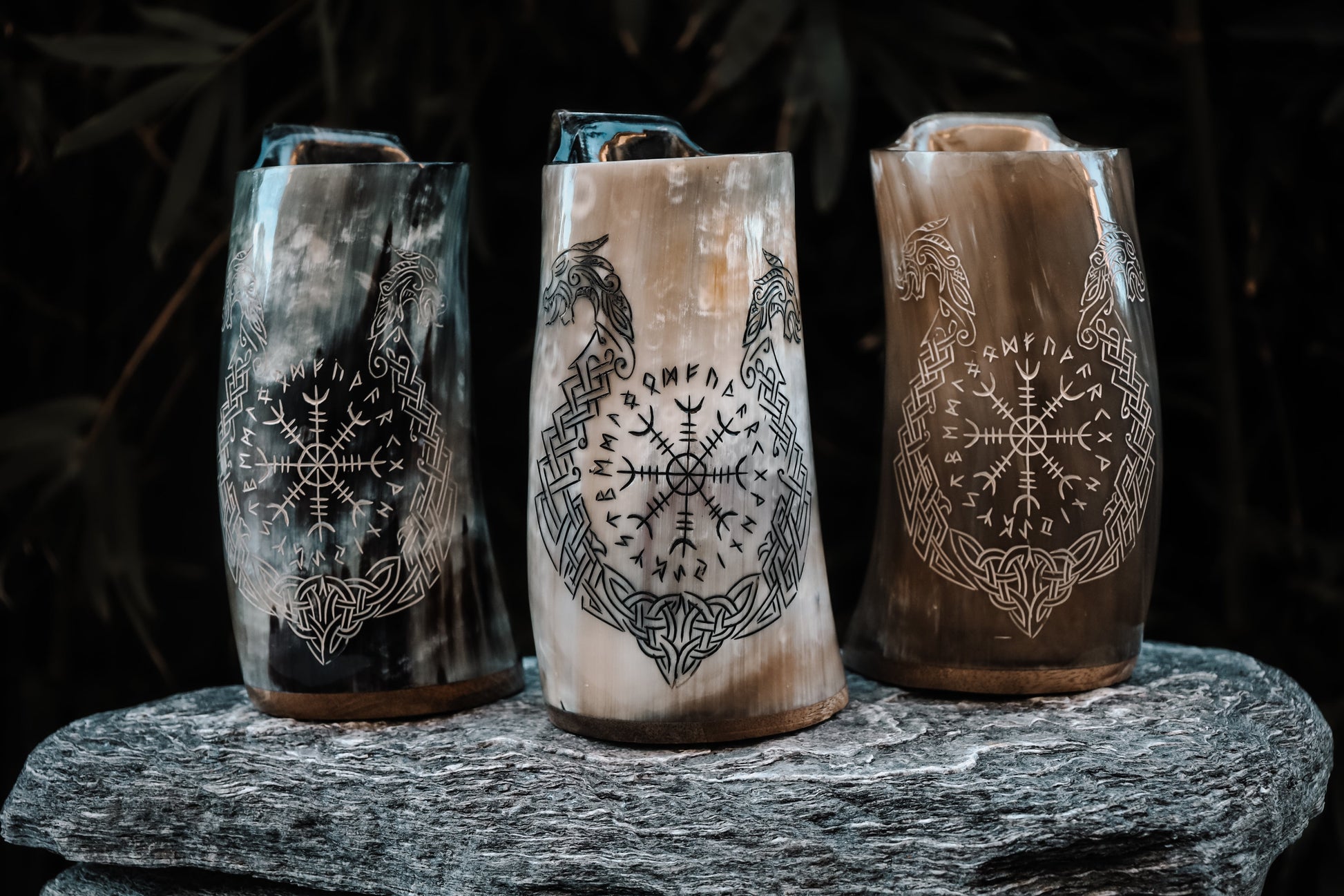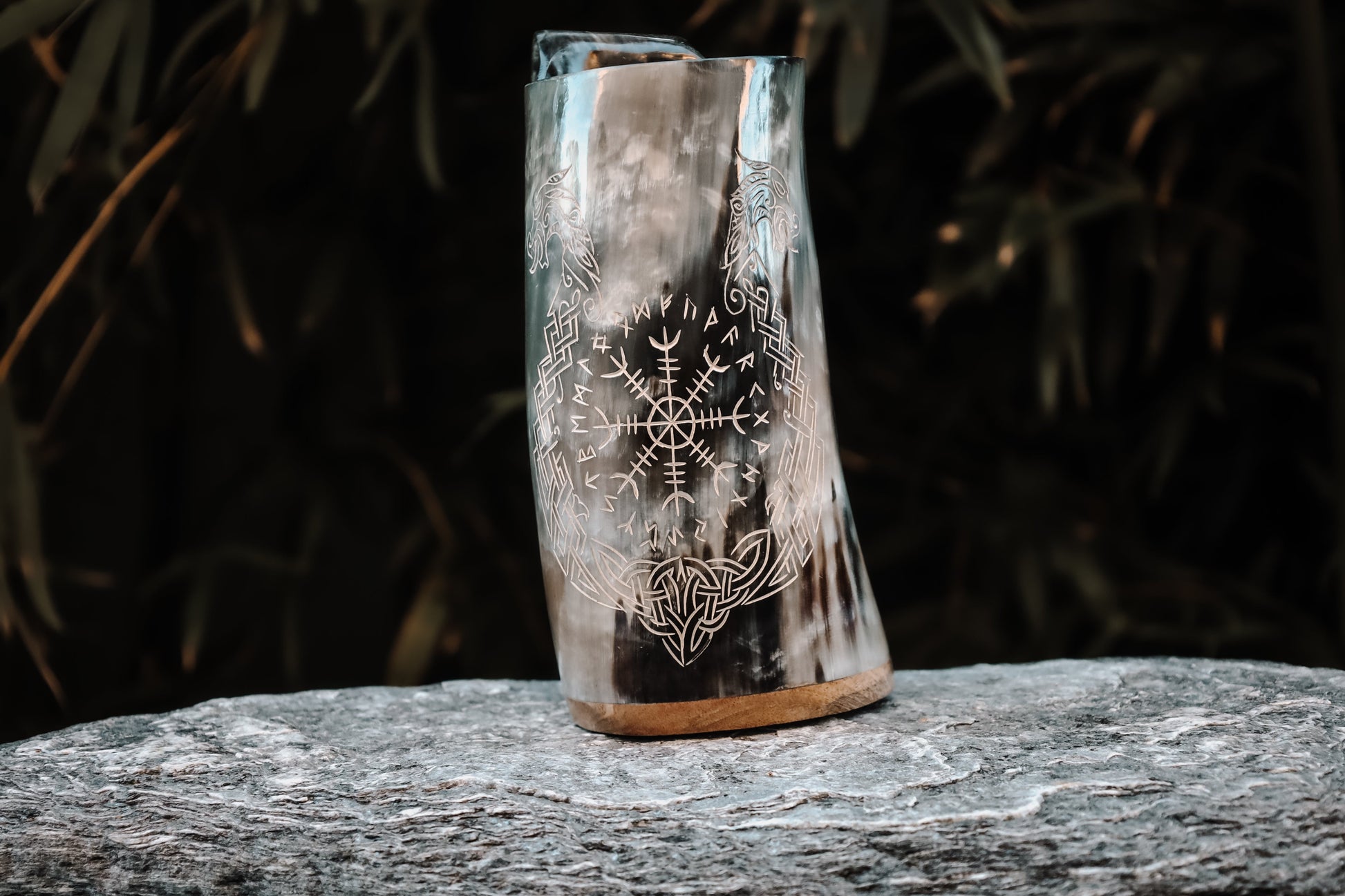 Note: This is a natural product. Each drinking vessel is hand-carved by an individual artist. Each vessel is unique in colour and craftsmanship. Items will differ in shape, colour, and size from the pictures displayed. Your vessel is one of a kind! You are the only Modern Viking in the world with this amazing piece. Skol!